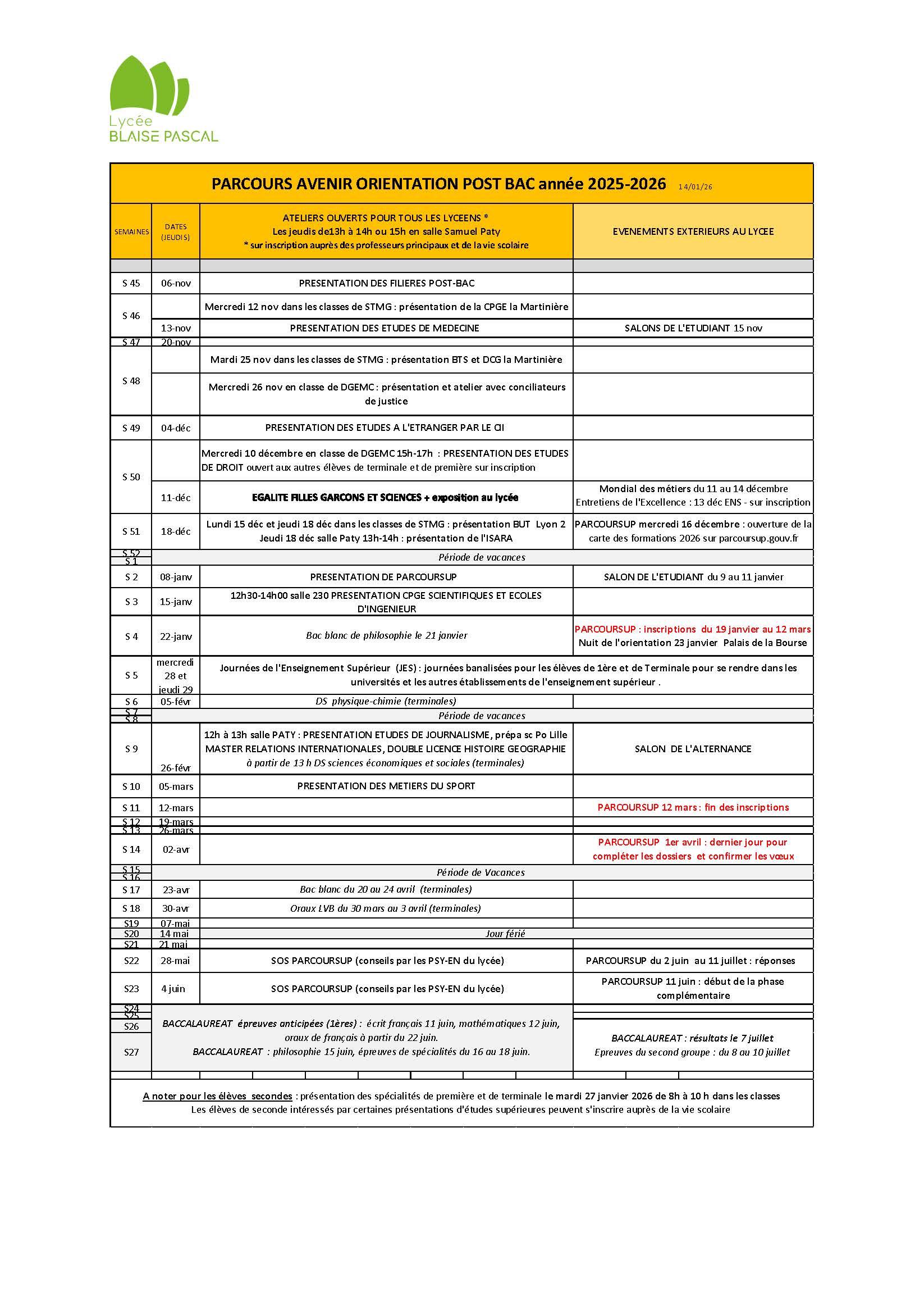 LES JEUDIS AU LYCEE : 12H-14H SALLE S.PATY (Inscriptions à la Vie scolaire)