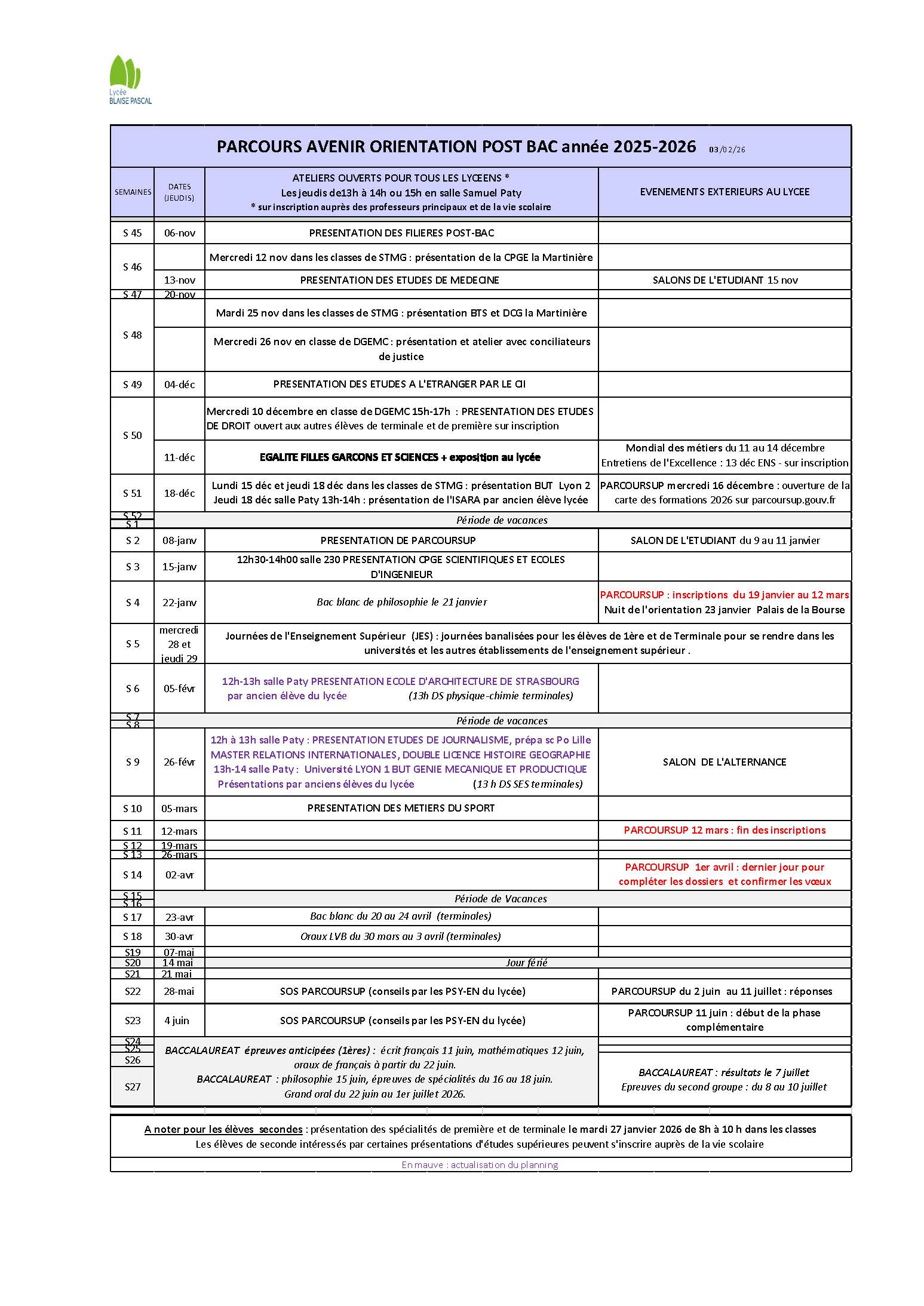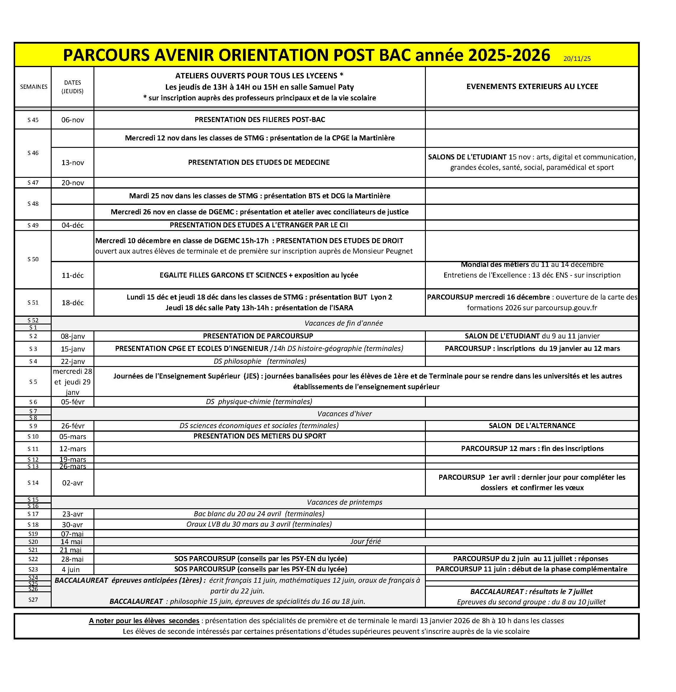LES JEUDIS AU LYCEE : 12H-14H SALLE S.PATY (Inscriptions à la Vie scolaire)