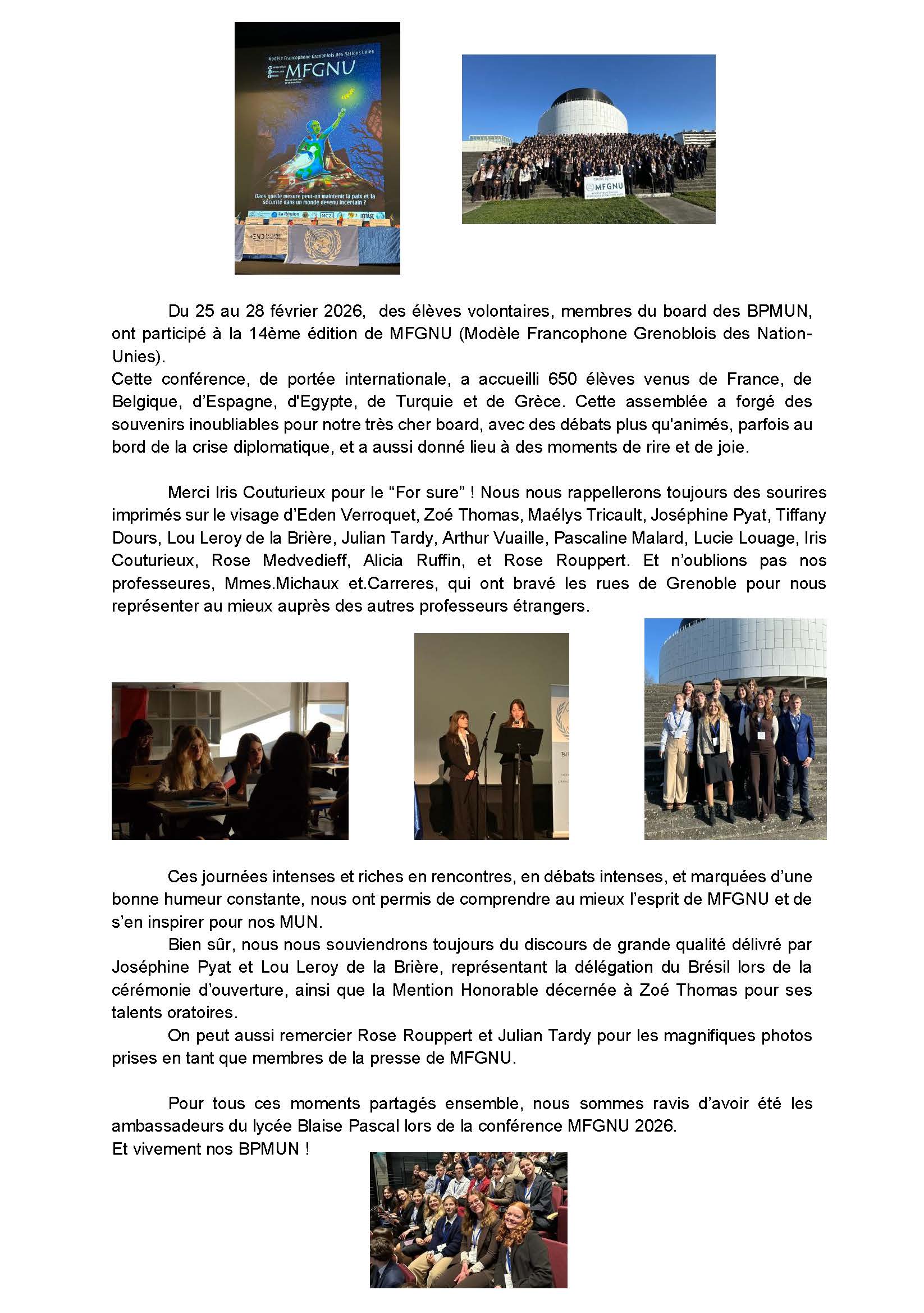 Du 25 au 28 février 2026, des élèves volontaires, membres du board des BPMUN, ont participé à la 14ème édition de MFGNU (Modèle Francophone Grenoblois des Nation-Unies).
