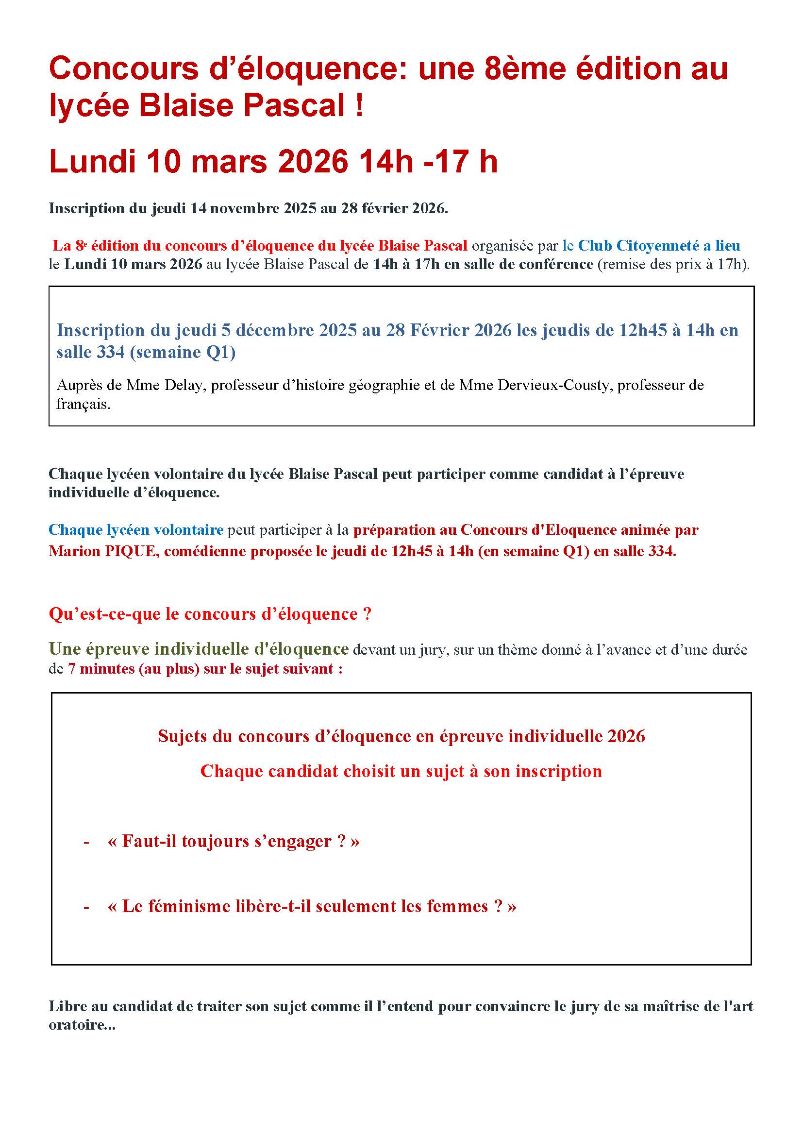 CONCOURS D'ELOQUENCE : INSCRIPTIONS AVANT LE 25.02